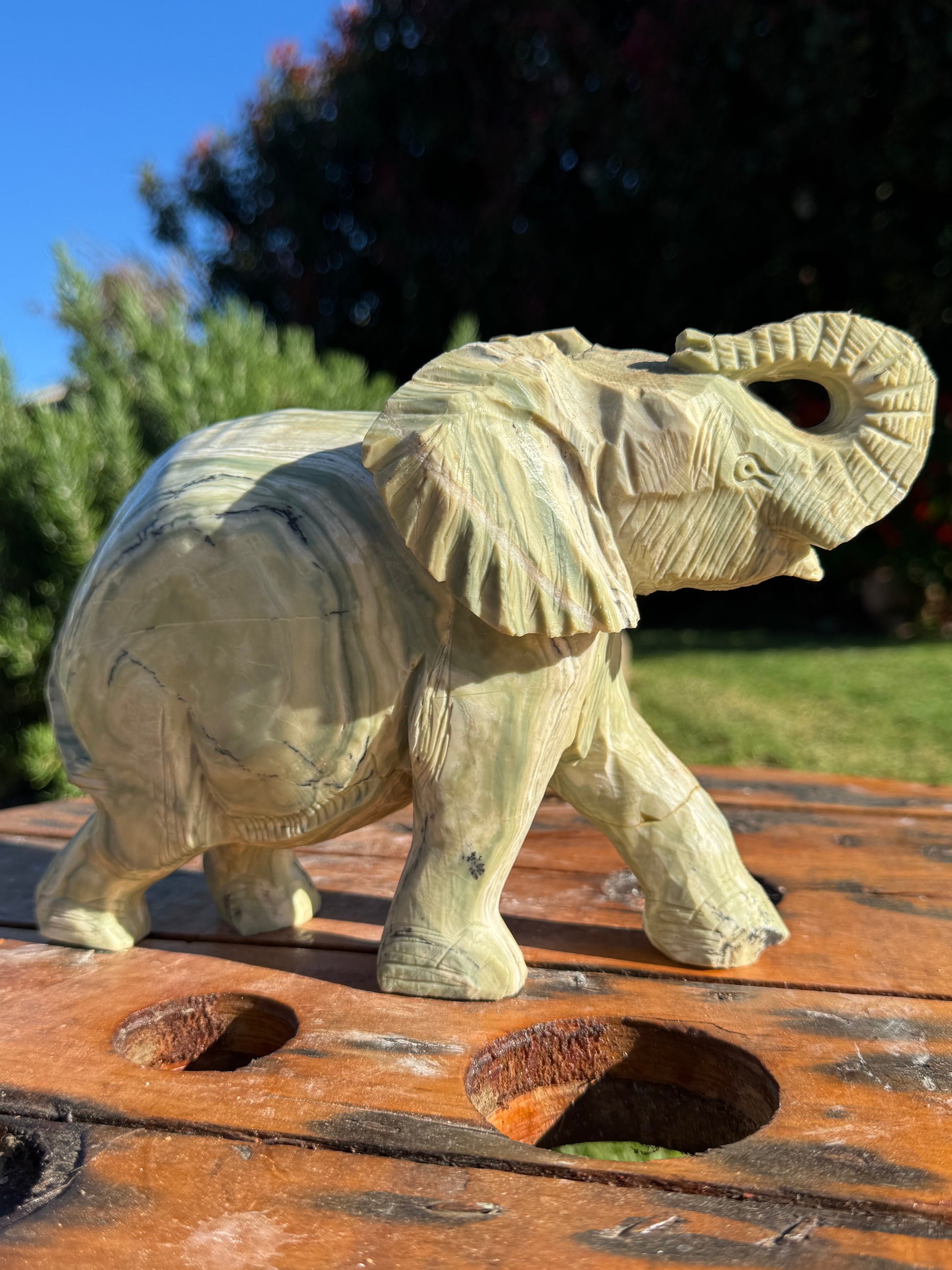 A timeless symbol of strength, wisdom, and protection, Elephant by Godfrey Chisahwira is a beautifully crafted piece carved from warm-toned Butter Jade. Weighing 2.5kg and measuring 16cm high by 20cm long, this sculpture is perfect for outdoor display—offering grounding energy and a watchful presence to any sacred space.