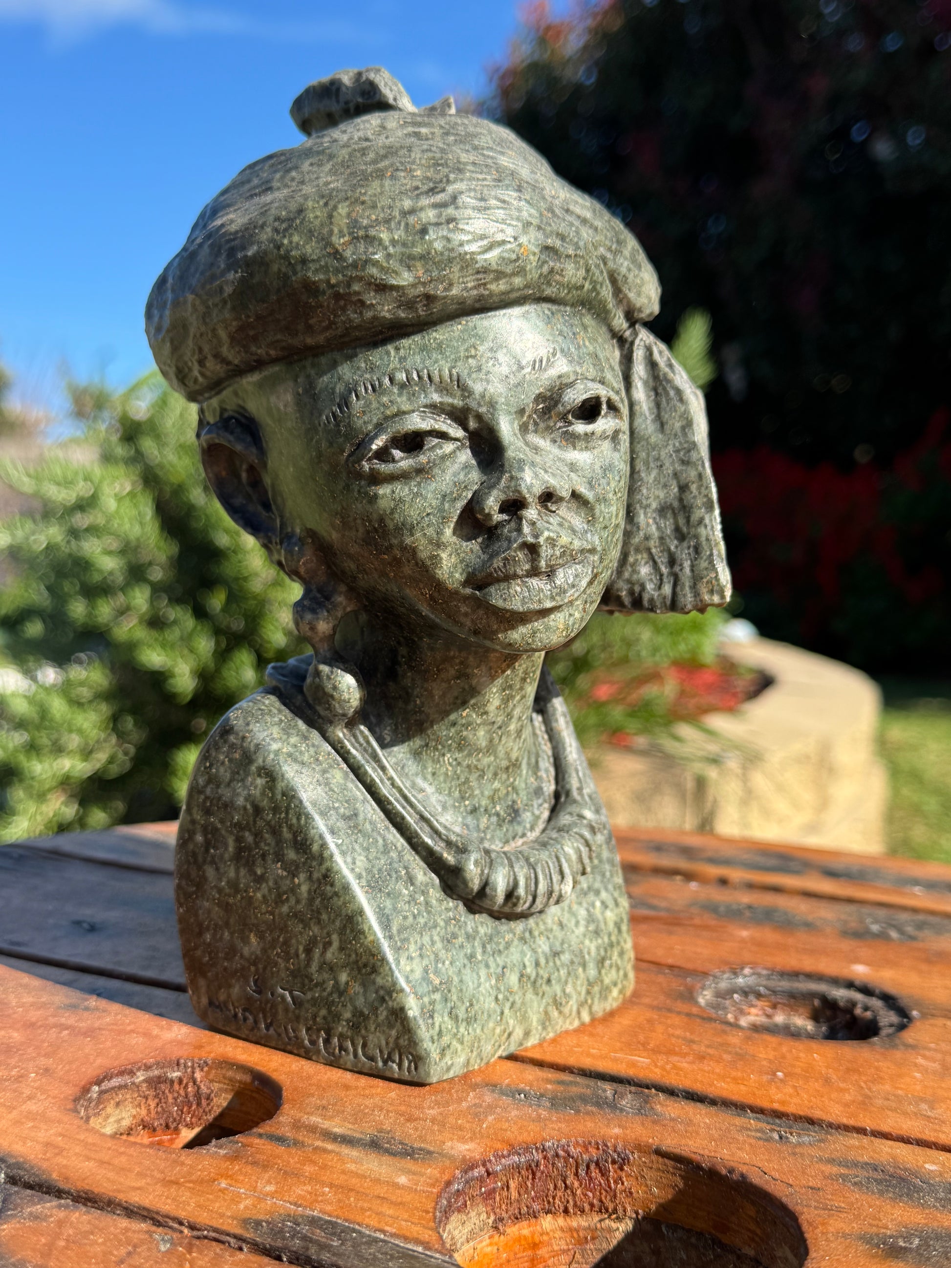 Elegant and dignified, Nigerian Woman by Tendal Nyakusenkew is a graceful tribute to cultural beauty and feminine strength. Carved from soft green Opal Stone, this 3.3kg sculpture stands 20cm tall and is best suited for indoor display—bringing warmth, presence, and heritage into any space.