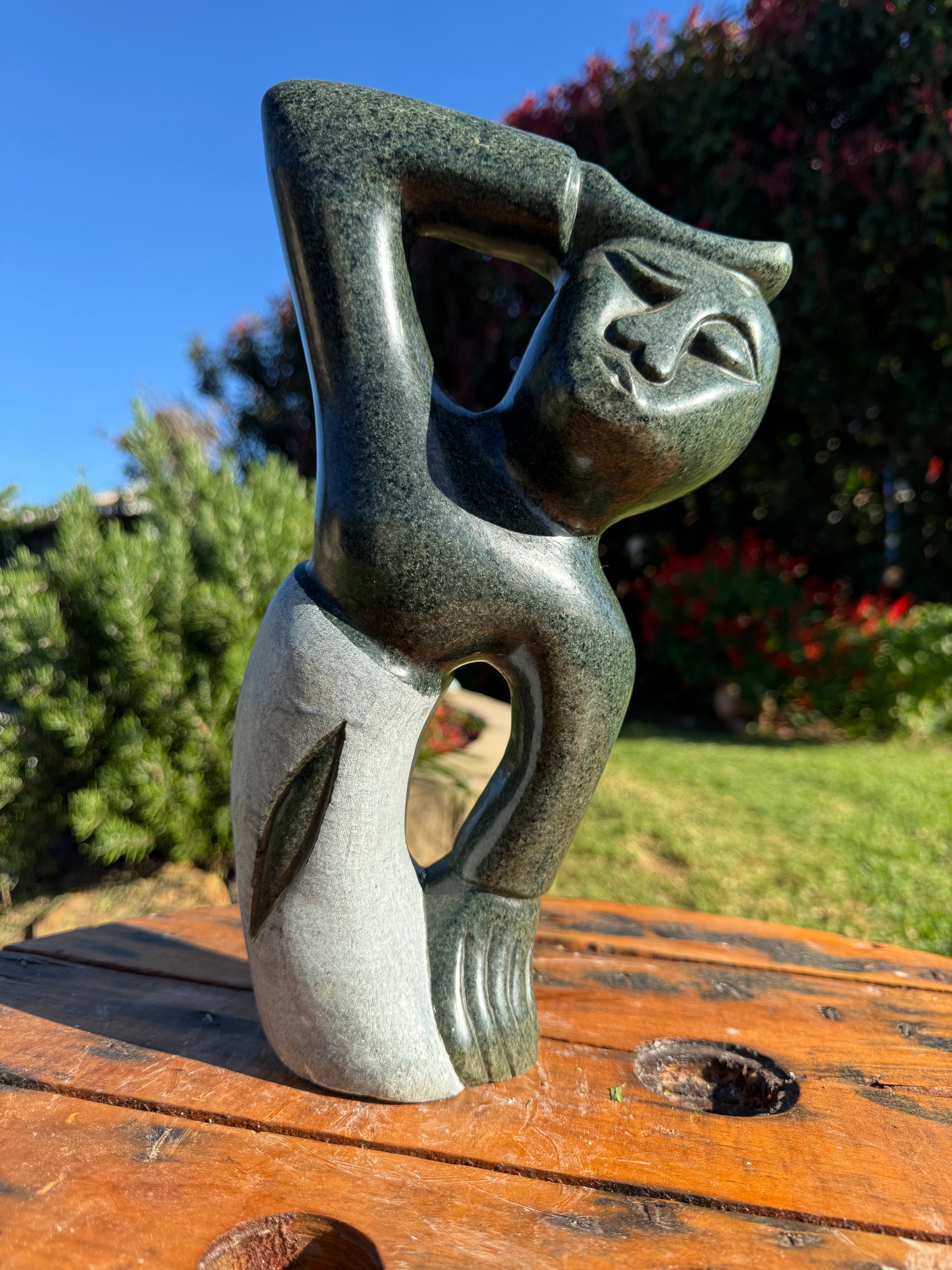 Radiating warmth and expression, The Sun is Hot by Wilbert Zvichauya is a striking sculpture carved from vibrant Fruit Serpentine. Standing 30cm tall and weighing 3.4kg, this evocative piece captures the power of the sun and the energy of life—bringing bold spirit and earthy vitality into any space.