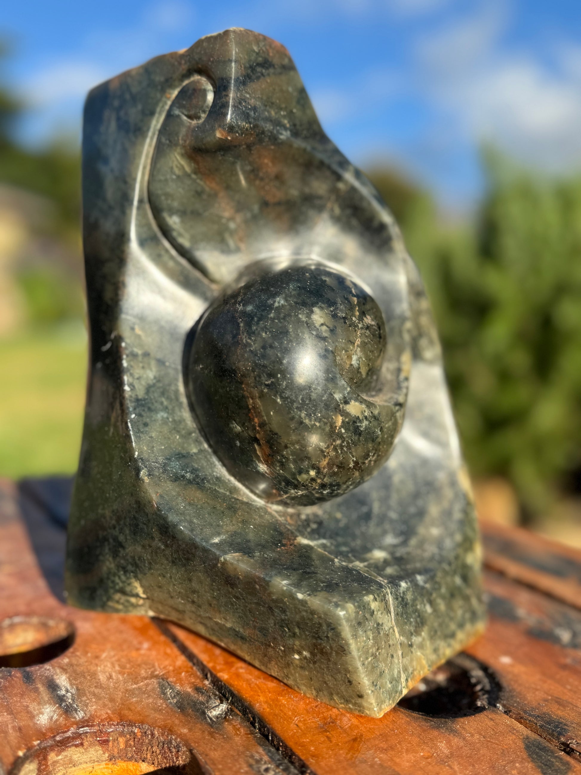 Full of quiet promise and transformation, Preparing to Bloom by Douglas Mundara is a graceful sculpture carved from vibrant Fruit Serpentine. Weighing 5.7kg and standing 22cm tall, it symbolises growth, renewal, and the beauty of becoming—perfect for a space that honours personal evolution and inner strength.